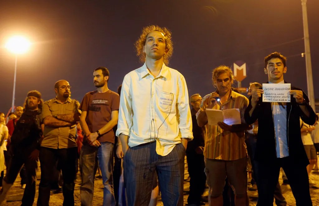 Über Facebook und Twitter verbreitete sich rasch die Nachricht von „Duran Adam“, dem „stehenden Mann“, wie es wörtlich heißt, besser: dem Mann, der einfach dasteht. Andere schlossen sich ihm an, in Istanbul, Ankara und anderen türkischen Städten, sogar in New York. Es war der türkische Choreograf Erdem Gündüz. Er wurde, wie der Spiegel schrieb, zur Ikone des Aufstands, des Aufstands der freien Individualität gegen die Gewaltherrschaft des Kollektivs, das von wenigen Autoritäten dominiert wird.