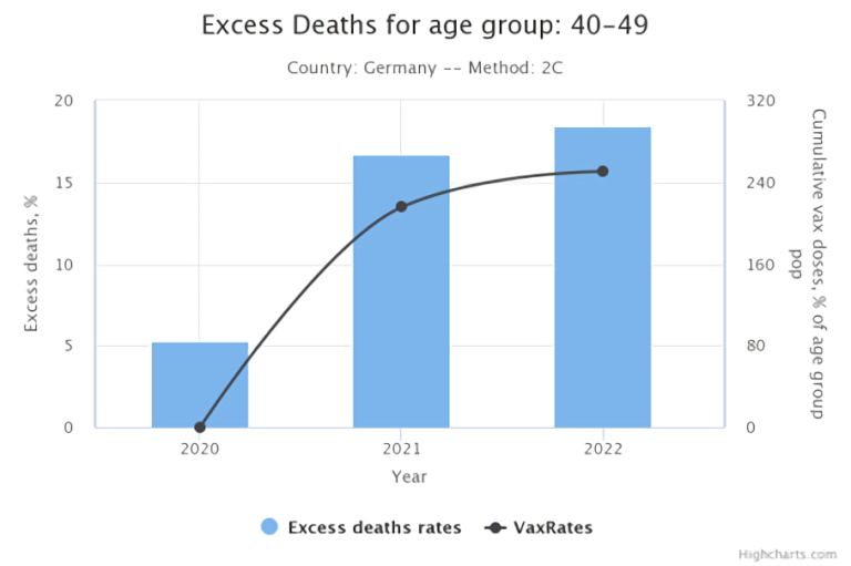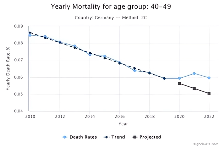 Er gründete ein eigenes Unternehmen und innerhalb des Unternehmens ein Humanity Project, mit dem er die Übersterblichkeiten analysiert. Für Deutschland sehen die Analysen für die Gruppe der 40-49-Jährigen so aus (Abb. 1 und 2)