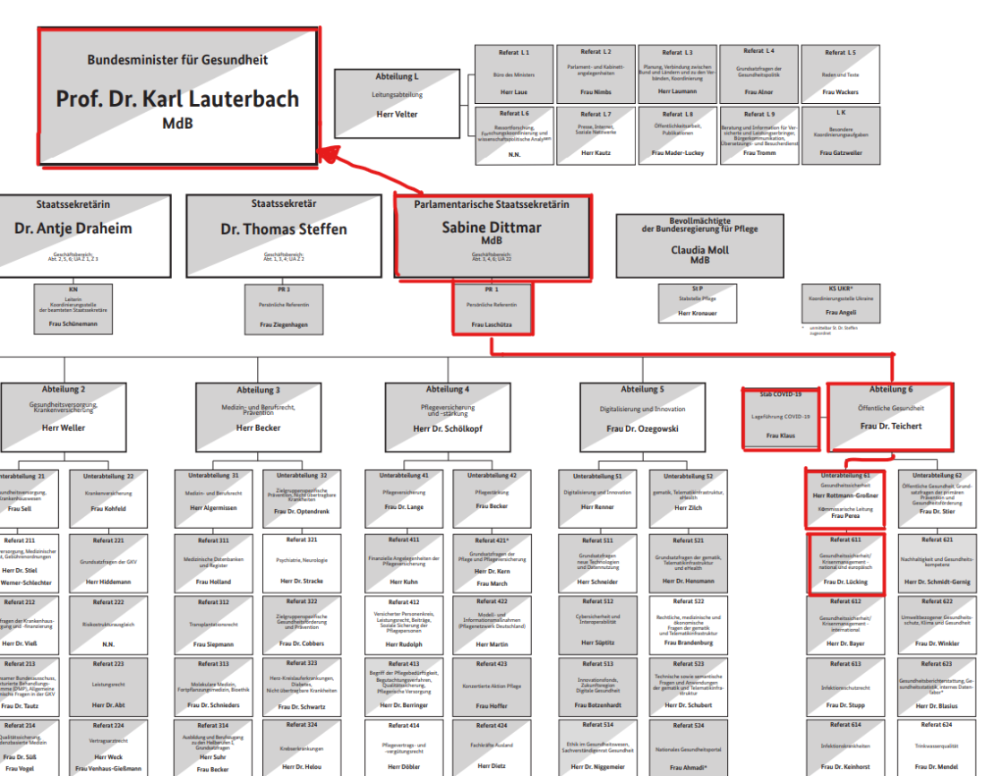 Die erstmalig im Referat 611 gelandete Email hätte von Frau Dr. Lücking an den Unterabteilungsleiter für Gesundheitssicherheit, Herrn Rottmann-Grossner (Referat 61), weitergeleitet werden müssen, bevor dieser Frau Dr. Teichert aus der Abteilung 6 und den Stab COVID-19 darüber informiert. Diese wiederum hätten jene entscheidungsträchtige Information an die parlamentarische Staatssekräterin Sabine Dittmar weiterreichen müssen. Diese wiederum wäre dann in der Pflicht gewesen, den Bundesminister für Gesundheit zu informieren, der mit dieser Kenntnis die Debatte über die Einführung der Impfplicht hätte ein für alle mal beilegen müssen.