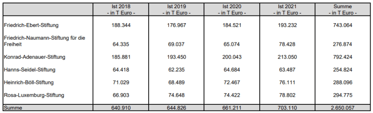 Es wird sie nicht verwundern zu erfahren, dass die Selbstbereicherung der Parteien damit nicht am Ende angelangt ist. Die folgende Tabelle listet die Zahlungen auf, die in den Jahren 2018 bis 2021 an die politischen Vereine der Parteien geflossen sind. Sie stammt aus einer Bundestagsdrucksache, ist somit über jeden Zweifel erhaben. Aus 421 Millionen Euro im Jahr 2010 sind nun 703 Millionen Euro geworden, ein Wachstum um 67%. In nur vier Jahren haben sich die Parteistiftungen von sechs Parteien 2,7 Milliarden Euro aus Steuergeldern angeeignet und sie in aller Welt und mit keinerlei erkennbarem gesellschaftlichen Nutzen verpulvert außer dem, als Auffangbecken für Parteisoldaten zu dienen, die nicht über ein politisches Amt finanziert werden können. Ansonsten kontrolliert niemand, wofür die politischen Vereine der Parteien ihre Steuerzahler-Zuwendungen aus dem Fenster werfen.