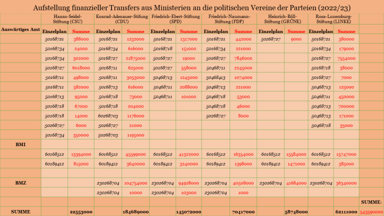 Mehr als eine halbe Milliarde Euro haben die fünf genannten Parteien über Töpfe, die im Auswärtigen Amt, im Bundesministerium des Innern und beim Bundesministerium für wirtschaftliche Zusammenarbeit stehen, im Jahr 2022 an ihre politischen Vereine überwiesen, damit diese politischen Vereine mit dem Geld Gutes tun. Also abgehalfterten Polit-Darstellern ein Gnadenbrot geben, Nachwuchs-Ideologen auf Kosten von Steuerzahlern heranziehen und ansonsten in aller Welt irgendetwas verbreiten und etwas tun, für das es keinerlei Beleg eines Nutzens für deutsche Steuerzahler gibt.