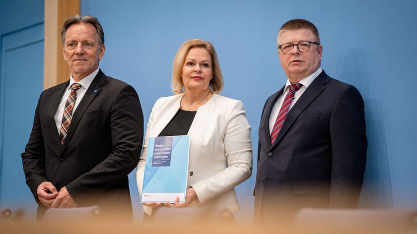 Bundesinnenministerin Nancy Faeser, SPD, mit ihren Gehilfen Thomas Haldenwang, CDU, (BfV), und Holger Münch (BKA)