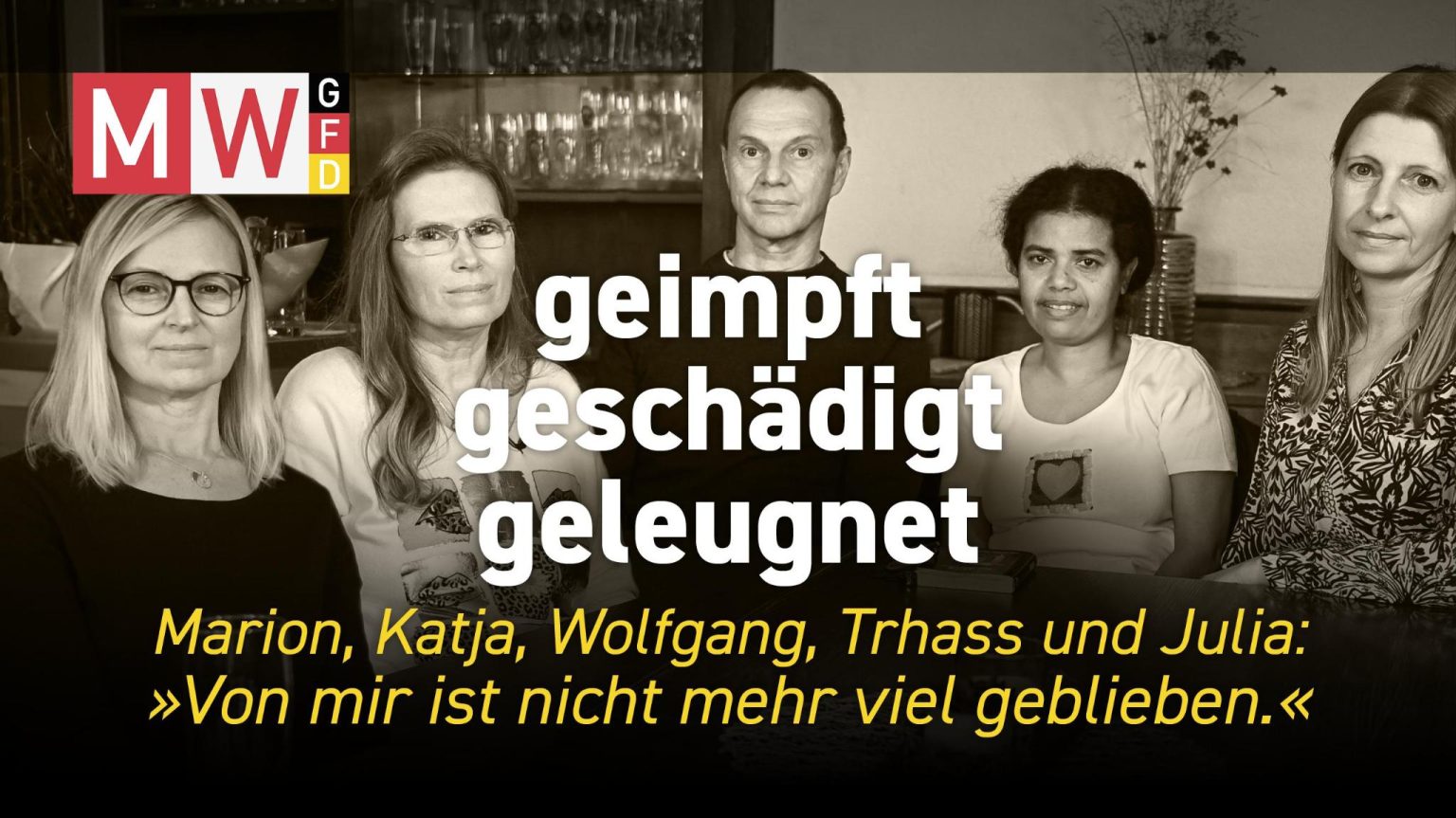 Die „Mediziner und Wissenschaftler für Gesundheit, Freiheit und Demokratie“ (MWGFD) bringen verdienstvollerweise wieder von Staat und Versicherungen im Sich gelassene Schwer-Impfgeschädigte in Erinnerung. „Marion, Katja, Wolfgang, Trhass und Julia kommen aus Bayern, Hessen, Sachsen, aus unterschiedlichen Berufen, mit unterschiedlichen Geschichten. Doch was sie verbindet, ist ihr Schicksal — und ihr Kampf um Anerkennung. Es sind Menschen, die einmal mitten im Leben standen. Heute sind sie Patientinnen und Patienten in der Spezialklinik Neukirchen, weil ihnen nach der Corona-Impfung die Gesundheit, das Leben und oft auch die Hoffnung genommen wurden. Im Gespräch mit Johannes Clasen berichteten sie über ihre Schicksale.“ (hl)