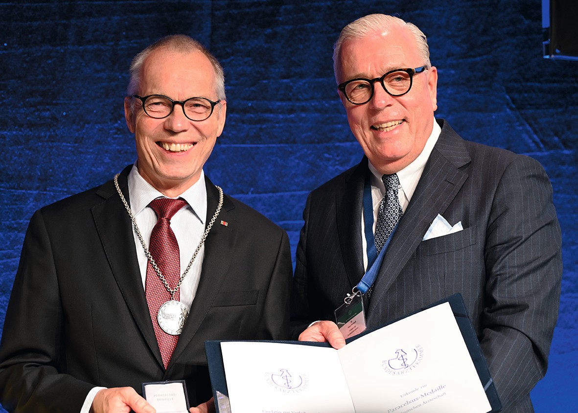 Bundesärztekammerpräsident Dr. med. Klaus Reinhardt überreichte Prof. Dr. Dr. med. René Gottschalk die Paracelsus-Medaille. Foto: Lucas Reus